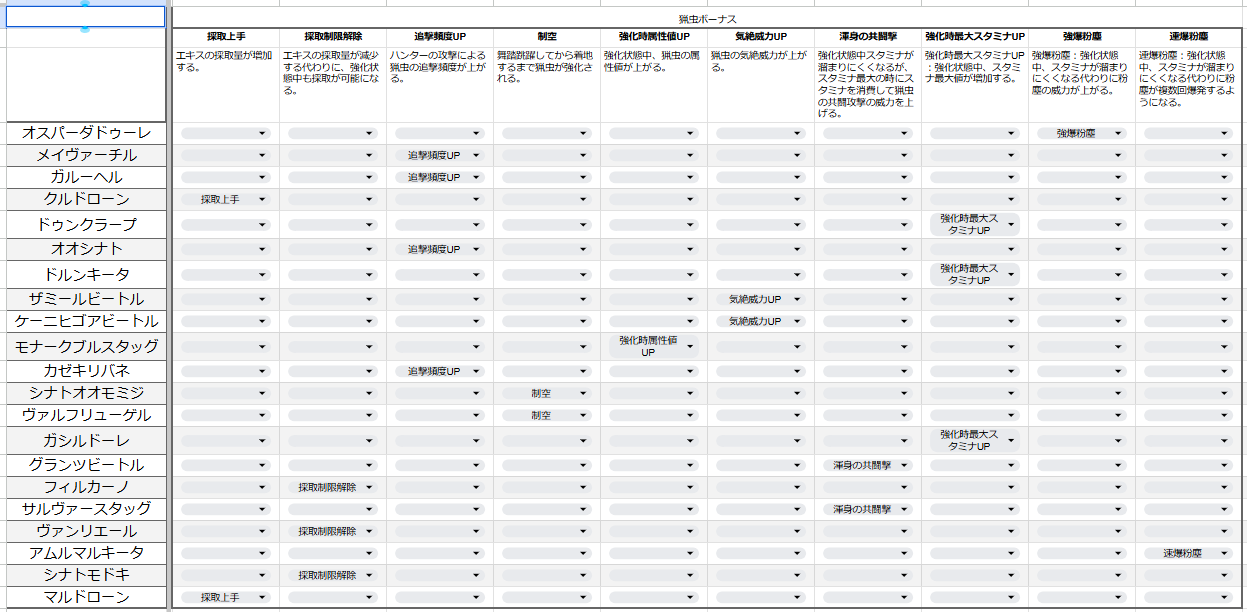 昔から操虫棍の虫は適当に選んでいたけれど、公式の説明を見ると緻密に作られているようなので、表にしてみた。